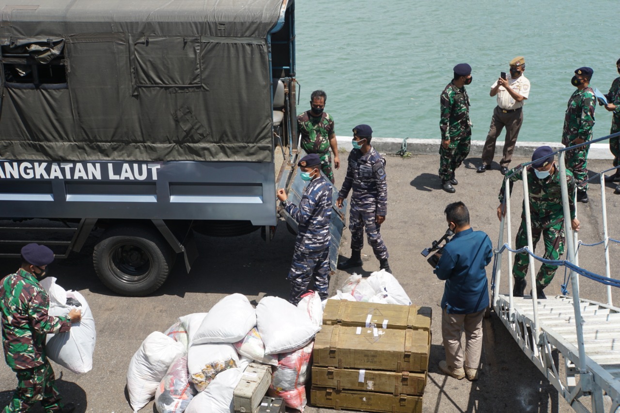 Bertempat di atas geladak kapal, Kepala Staf Koarmada II, Laksma TNI Dafit Santoso mewakili Pangkoarmada II Laksda TNI I N.G. Sudihartawan, menerima bantuan yang diserahkan langsung secara simbolis oleh Komandan Lantamal V Surabaya Laksma TNI M. Zainal, Senin (5/4/2021).