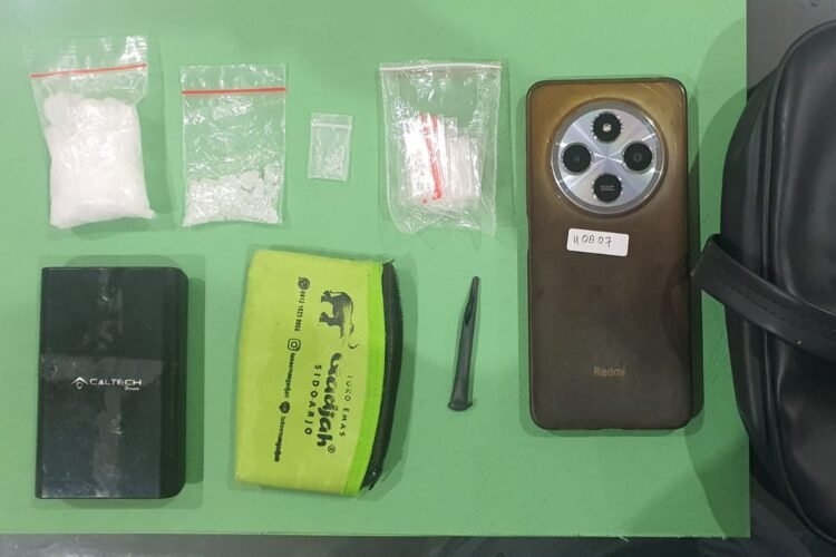 Selain itu, turut diamankan timbangan elektrik warna hitam, skrop dari sedotan, tujuh plastik klip kosong, dompet, serta tas yang diduga digunakan untuk aktivitas peredaran narkotika.