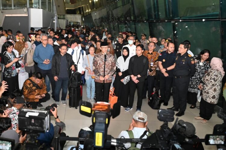 “Kami mengucapkan selamat datang kembali ke Indonesia dan selamat berkumpul bersama keluarga” ujar Menlu Sugiono saat menyambut kedatangan para WNI.