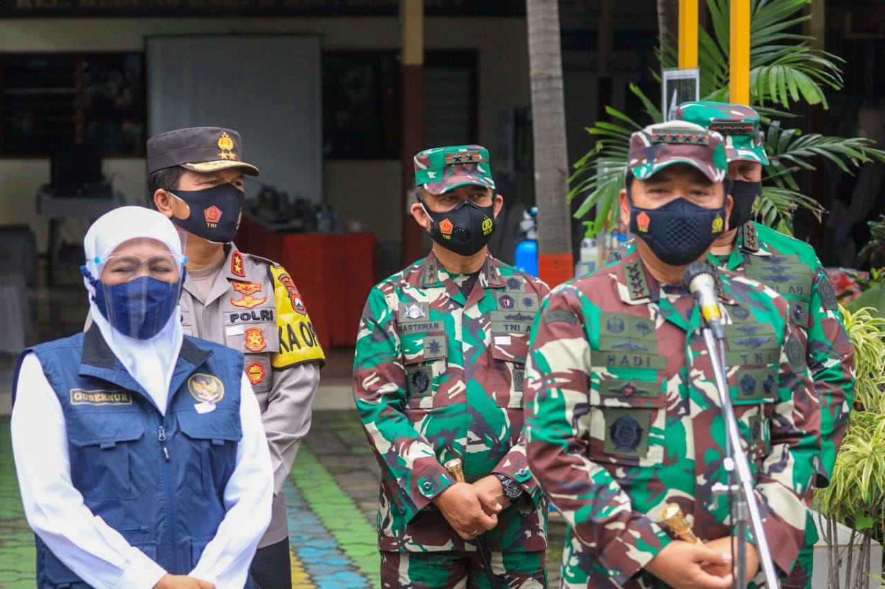 Gubernur Jawa Timur, Khofifah Indar Parawansa beserta pejabat Forkopimda, serta sejumlah petinggi TNI /Polri di wilayah Jawa Timur turut pula mendampingi Panglima TNI dalam peninjauan posko PPKM Mikro yang berada di Jalan Raya Kedung Asem RT IV RW V, Kelurahan Kedung Baruk, Kecamatan Rungkut Surabaya